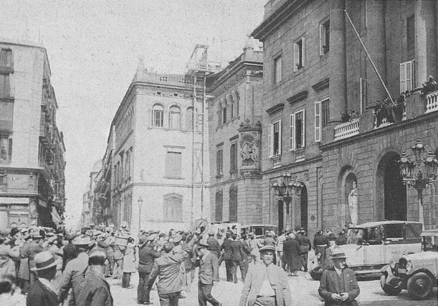 Primers vianants a la plaça de Sant Jaume després de presenciar la proclamació de la República. (Barcelona-Atracción, juny de 1931)