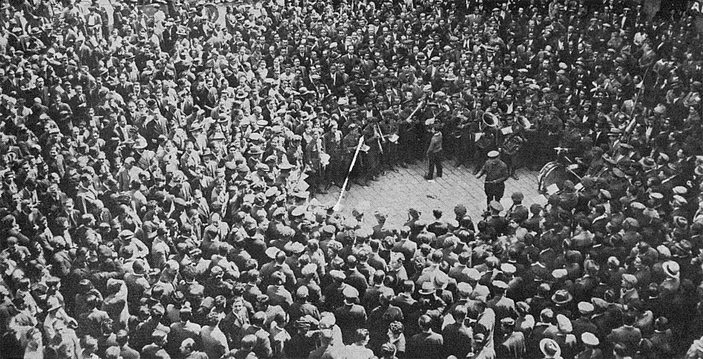 Poques hores després, la primera banda militar interpreta “La marsellesa” i música popular catalana davant un públic entregat. (Barcelona-Atracción, juny de 1931)