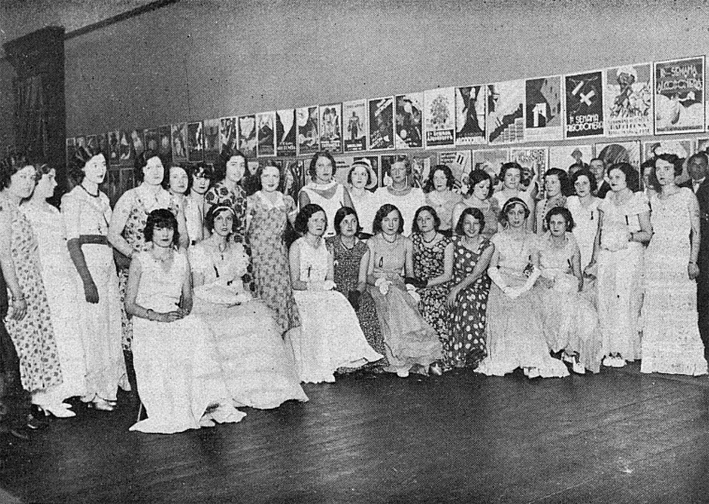Instantània del Ball Cotoner, amb un grup de dones posant, durant la Setmana Cotonera de maig de 1931. (Barcelona-Atracción, juliol de 1931)