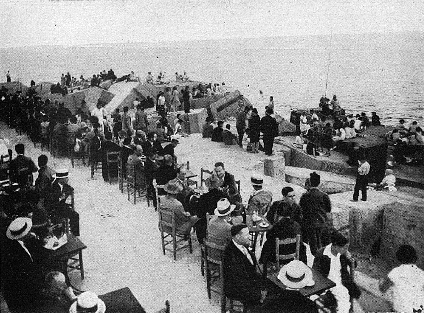 Escena de lleure amb gent prenent refrescos a l’escullera de Llevant. (Barcelona-Atracción, agost de 1931)